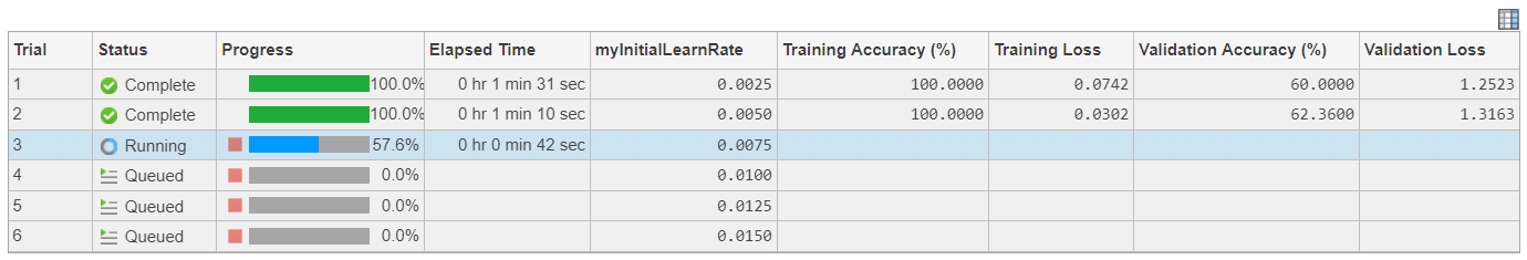 В Experiment Manager нажмите Run. Experiment Manager обучает сеть, заданную функцией настройки шесть раз. Каждое испытание использует одну из скоростей обучения, заданных в гипертаблице параметров. Таблица результатов показывает точность и потерю для каждого испытания.