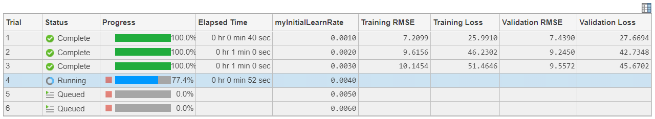 В Experiment Manager нажмите Run. Experiment Manager обучает сеть, заданную функцией настройки шесть раз. Каждое испытание использует одну из скоростей обучения, заданных в гипертаблице параметров. Таблица результатов показывает среднеквадратическую ошибку (RMSE) и потерю для каждого испытания.