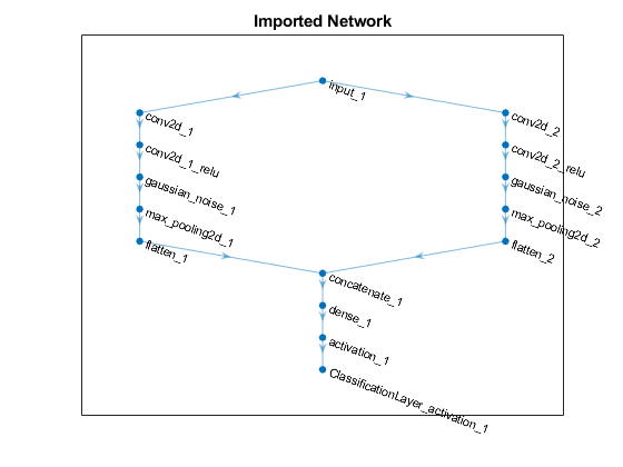 Импортируйте слои из сетевой модели Keras. Сеть в 'digitsDAGnetwithnoise.h5' классифицирует изображения цифр.