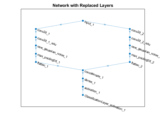 Задайте пользовательский Гауссов шумовой слой. Чтобы создать этот слой, сохраните файл gaussianNoiseLayer.m в текущей папке. Затем создайте два Гауссовых шумовых слоя с теми же настройками как импортированные слои Keras.
