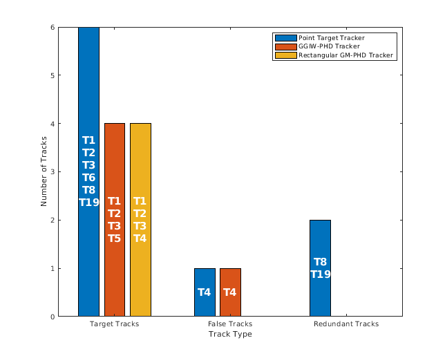 Метрики присвоения иллюстрируют, что избыточные и ложные дорожки были инициализированы и подтверждены средством отслеживания точечного объекта. Эти дорожки заканчиваются из-за несовершенной кластеризации, где обнаружения, принадлежащие той же цели, кластеризировались больше чем в одно кластеризованное обнаружение. В отличие от этого средство отслеживания GGIW-PHD и средство отслеживания GM-PHD обеспечивают дорожки на всех четырех целях и не создают ложных или избыточных дорожек. Эти метрики показывают, что и расширенные объектные средства отслеживания правильно делят обнаружения и сопоставляют их с правильными дорожками.