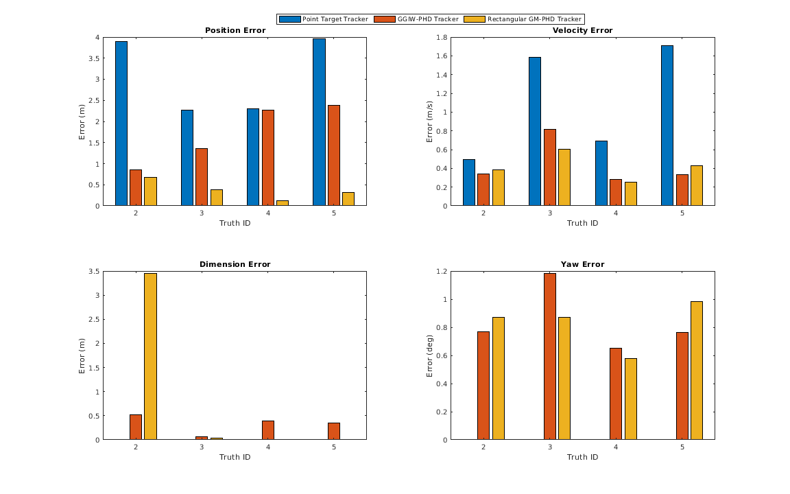 График показывает средние ошибки оценки для трех типов средств отслеживания, используемых в этом примере. Поскольку средство отслеживания точечного объекта не оценивает отклонение от курса и размерности объектов, их теперь показывают в графиках. Средство отслеживания точечного объекта может оценить кинематику объектов с разумной точностью. Ошибка положения транспортного средства позади автомобиля, оборудованного датчиком выше, потому что это было перетащено налево, когда проходящее мимо транспортное средство обгоняет это транспортное средство. Это - также артефакт кластеризации имперфекта, когда объекты друг близко к другу.