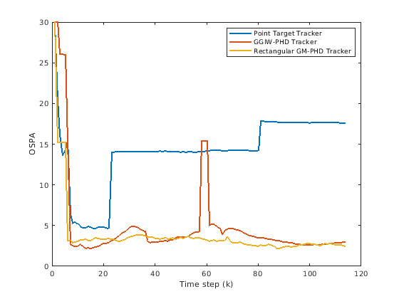 Аналогичный описанному ранее, метрика OSPA стремится описывать производительность алгоритма отслеживания с помощью одного счета. Заметьте, что OSPA достаточно получает производительность алгоритма отслеживания, который уменьшается от GM-PHD до GGIW-PHD к целевому точкой средству отслеживания, аналогичное описанному использование метрики присвоения и ошибка.
