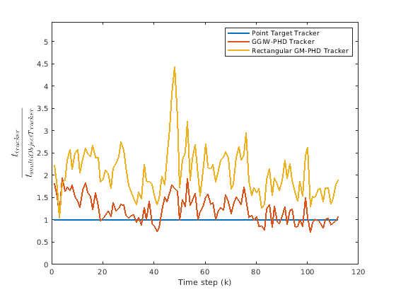 runTimeFig = figure; h = plot(trackerRunTimes(3:end,:)./trackerRunTimes(3:end,1),'LineWidth',2); legend('Point Target Tracker','GGIW-PHD Tracker','Rectangular GM-PHD Tracker'); xlabel('Time step (k)'); ylabel('$$\frac{t_{tracker}}{t_{multiObjectTracker}}$$','interpreter','latex','fontsize',14); ylim([0 max([h.YData]) + 1]);