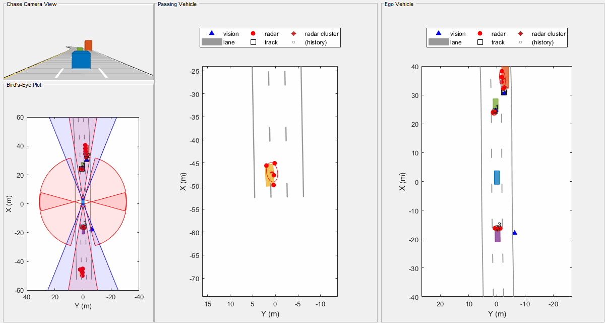 В этом примере вы симулируете автомобиль, оборудованный датчиком, который имеет 6 радарных датчиков и 2 датчика видения, покрывающие полное поле зрения. Датчики имеют некоторое перекрытие и некоторый разрыв покрытия. Автомобиль, оборудованный датчиком оборудован радарным датчиком дальним и датчиком видения на обоих передняя и задняя часть транспортного средства. Каждая сторона транспортного средства имеет два ближних радарных датчика, каждый покрывающий 90 градусов. Один датчик на каждой стороне покрывает с середины транспортного средства к спине. Другой датчик на каждой стороне покрывает с середины транспортного средства вперед.