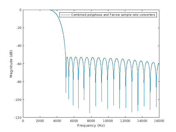 [Hsrc,f] = freqz(intSampRateConv); Fsfar = 32e3*441; Hfsrc = freqz(farrowSampRateConv,f,Fsfar); Hhybrid = Hsrc.*Hfsrc; Hhybrid_norm = Hhybrid/norm(Hhybrid,inf); % Normalize magnitude to 0 dB plot(f,20*log10(abs(Hhybrid_norm))); xlabel('Frequency (Hz)') ylabel('Magnitude (dB)') legend('Combined polyphase and Farrow sample rate converters', ... 'Location','NorthEast')