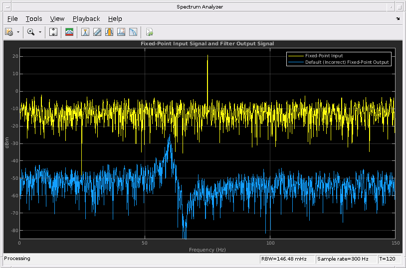 scope = dsp.SpectrumAnalyzer('SampleRate',300, ... 'PlotAsTwoSidedSpectrum',false, ... 'ShowLegend',true,'YLimits',[-85 25], ... 'Title','Fixed-Point Input Signal and Filter Output Signal', ... 'ChannelNames', ... {'Fixed-Point Input','Default (Incorrect) Fixed-Point Output'}); rng(12345); % seed the rng for repeatable results bqLPFiltFixpt = dsp.BiquadFilter('SOSMatrixSource','Input port', ... 'ScaleValuesInputPort',false); for k = 1:10 inp_sig = rand(inp_len,1) - 0.5; % random values in range (-0.5, 0.5) inputFi = fi(inp_sig + inp_itf, 1, 16, 15); % signal range (-1.0, 1.0) out_2 = bqLPFiltFixpt(inputFi,fi(num,1,16),fi(den,1,16)); scope([inputFi,out_2]) % visualize end