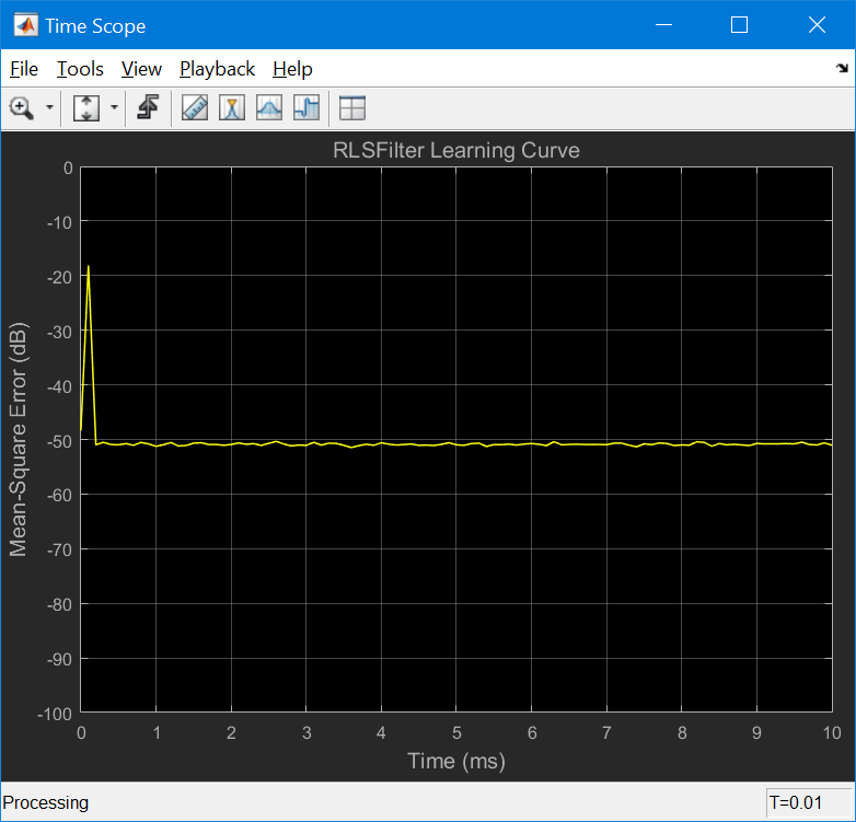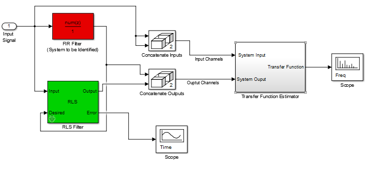 Неизвестная система моделируется КИХ-фильтром lowpass. Тот же вход питается фильтры RLS и КИХ. Желаемым сигналом является выход неопознанной системы. Предполагаемые веса фильтра RLS поэтому сходятся к коэффициентам КИХ-фильтра. Коэффициенты фильтра RLS и КИХ-фильтра используются динамическим фильтром visualizer, чтобы визуализировать желаемую и предполагаемую частотную характеристику. Кривая обучения фильтра RLS (график среднеквадратичной погрешности (MSE) фильтра по сравнению со временем) также визуализируется.
