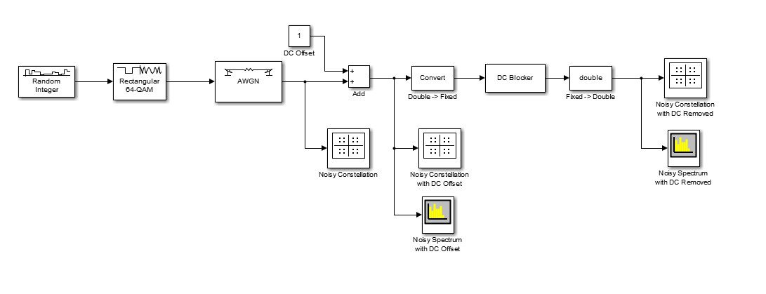 Этот блок реализует алгоритм, входные параметры и выходные параметры, описанные на dsp.DCBlocker страница с описанием. Свойства объектов соответствуют параметрам блоков.