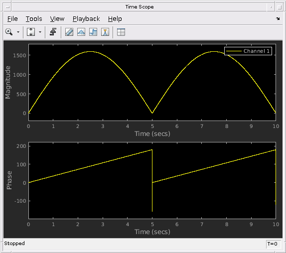 fs = 1000; t = (0:1/fs:10)'; CxSine = cos(2*pi*0.2*t) + 1i*sin(2*pi*0.2*t); CxSineSum = cumsum(CxSine); scope = dsp.TimeScope(1,fs,'TimeSpanSource','Auto','ShowLegend',1); scope(CxSineSum); scope.AxesScaling = 'Auto';