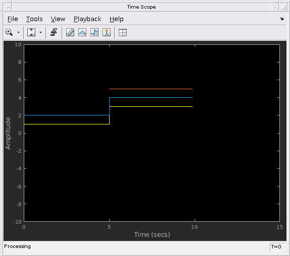 fs = 10; sigdim2 = [ones(5*fs,1) 1+ones(5*fs,1)]; % 2-dim 0-5 s sigdim3 = [2+ones(5*fs,1) 3+ones(5*fs,1) 4+ones(5*fs,1)]; % 3-dim 5-10 s scope = dsp.TimeScope(2,fs,'TimeSpanSource','Property'); scope.PlotType = 'Stairs'; scope.TimeSpanOverrunAction = 'Scroll'; scope.TimeDisplayOffset = [0 0 5]; scope([sigdim2; sigdim3(:,1:2)], sigdim3(:,3));