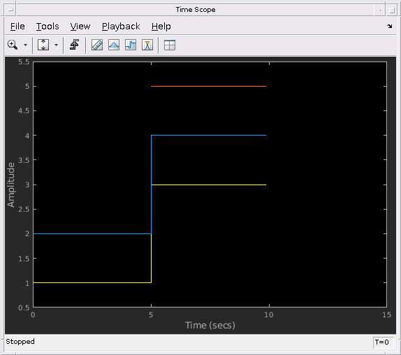В этом примере размере входного сигнала к изменениям блока Time Scope, когда прогрессирует симуляция. Когда время симуляции меньше 5 секунд, Осциллограф Времени строит только двухканальный сигнал, sigdim2. После 5 секунд Осциллограф Времени также строит сигнал с тремя каналами, sigdim3.