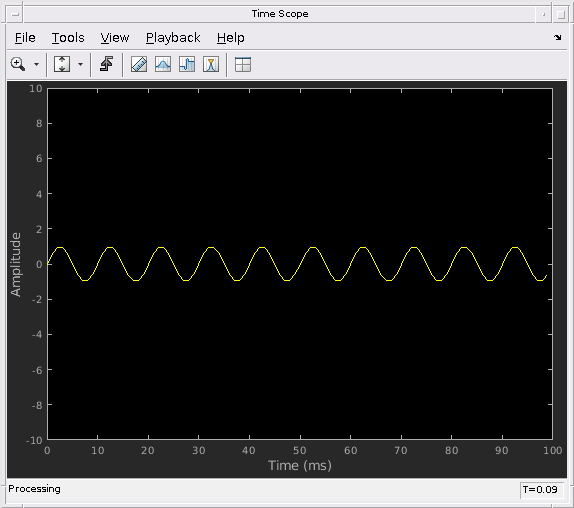 sine = dsp.SineWave('Frequency',100,'SampleRate',1000); sine.SamplesPerFrame = 10; scope = dsp.TimeScope('SampleRate',sine.SampleRate,'TimeSpan',0.1); for ii = 1:10 x = sine(); scope(x); end