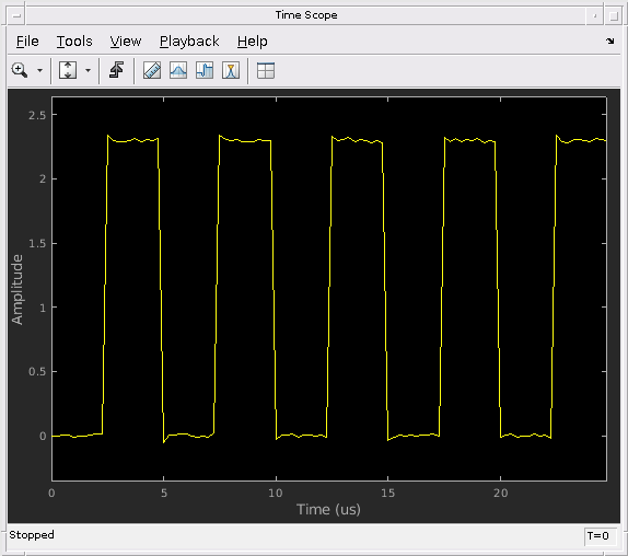 Первоначально, Осциллограф Времени не отображает возрастающий параметр Времени урегулирования ребра. Это отсутствие происходит, потому что значение по умолчанию Того, чтобы улаживать Ищет, параметр более длинен, чем целая длительность симуляции.