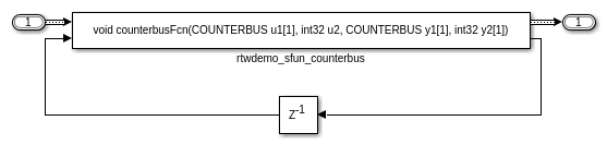 После того, как вы будете компилировать S-функцию и использовать ее в симуляции, можно вызвать функцию legacy_code () снова с первым входным набором к 'sfcn_tlc_generate', чтобы сгенерировать файл блока TLC. Файл блока задает, как сгенерированный код для модели вызывает унаследованный код. Если вы не генерируете файл блока TLC, и вы пытаетесь сгенерировать код для модели, которая включает S-функцию, сбои генерации кода. Файл блока TLC для S-функции: rtwdemo_sfun_counterbus.tlc.