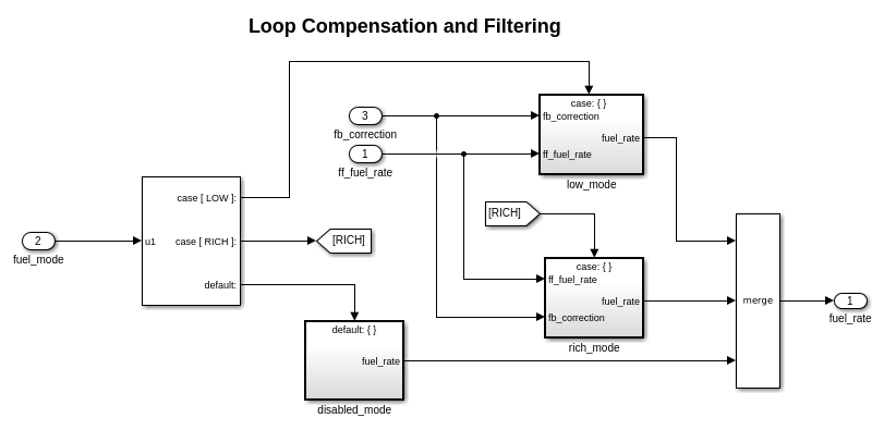 Эта подсистема корректирует и фильтрует шум из топливного сигнала уровня. Подсистема использует различные коэффициенты фильтра на основе режима заправки, который управляющая логика изменяет на основе отказов датчика в механизме. Например, алгоритм управления активирует low_mode подсистема во время нормального функционирования. Это активирует rich_mode подсистема в ответ на отказ датчика.