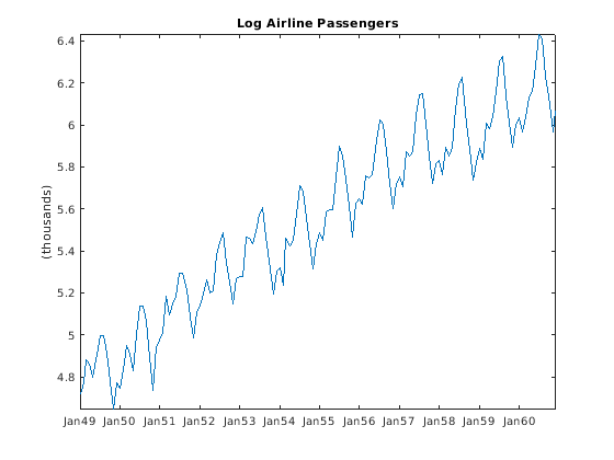 load('Data_Airline.mat') y = log(Data); T = length(y); figure plot(dates,y) xlim([1,T]) datetick('x','mmmyy') axis tight title('Log Airline Passengers') ylabel('(thousands)')