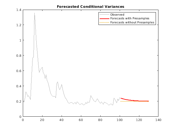Если условная модель Mdl отклонения имеет смещение (Mdl.Offset), forecast вычитает его из заданных преддемонстрационных ответов Y0 получить преддемонстрационные инновации E0. Впоследствии, forecast использование E0 инициализировать условную модель отклонения для прогнозирования.