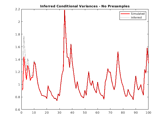 vI = infer(Mdl,y); figure plot(1:100,v,'r','LineWidth',2) hold on plot(1:100,vI,'k:','LineWidth',1.5) legend('Simulated','Inferred','Location','NorthEast') title('Inferred Conditional Variances - No Presamples') hold off