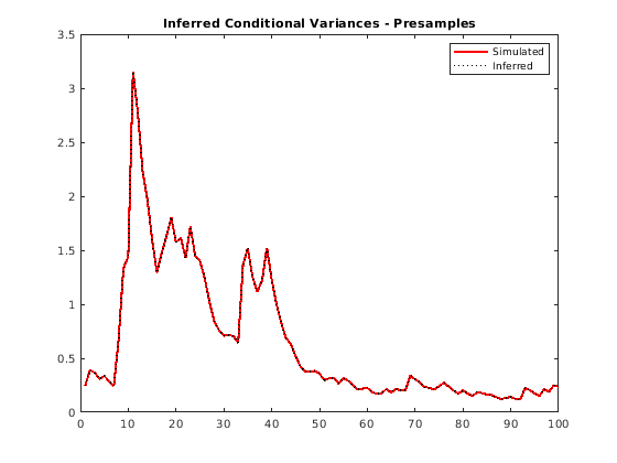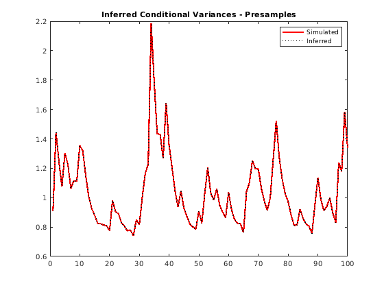 vEO = infer(Mdl,y,'E0',y0,'V0',v0); figure plot(v) plot(1:100,v,'r','LineWidth',2) hold on plot(1:100,vEO,'k:','LineWidth',1.5) legend('Simulated','Inferred','Location','NorthEast') title('Inferred Conditional Variances - Presamples') hold off