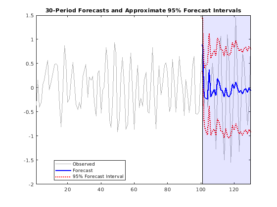 [yF,yMSE] = forecast(EstMdl,30,'Y0',y(1:100),... 'X0',X(1:100,:),'XF',X(101:end,:)); figure plot(y,'Color',[.7,.7,.7]); hold on plot(101:130,yF,'b','LineWidth',2); plot(101:130,yF+1.96*sqrt(yMSE),'r:',... 'LineWidth',2); plot(101:130,yF-1.96*sqrt(yMSE),'r:','LineWidth',2); h = gca; ph = patch([repmat(101,1,2) repmat(130,1,2)],... [h.YLim fliplr(h.YLim)],... [0 0 0 0],'b'); ph.FaceAlpha = 0.1; legend('Observed','Forecast',... '95% Forecast Interval','Location','Best'); title(['30-Period Forecasts and Approximate 95% '... 'Forecast Intervals']) axis tight hold off
