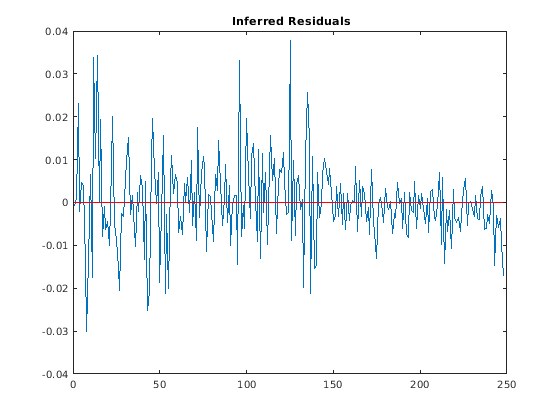 [E,U,V,logL] = infer(Mdl,Y) дополнительно возвращает безусловные воздействия U, инновационные отклонения V, и значения целевой функции логарифмической правдоподобности logL.
