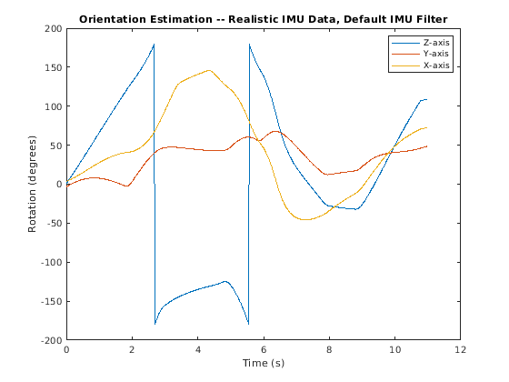 IMU.Accelerometer = accelparams( ... 'MeasurementRange',19.62, ... 'Resolution',0.00059875, ... 'ConstantBias',0.4905, ... 'AxesMisalignment',2, ... 'NoiseDensity',0.003924, ... 'BiasInstability',0, ... 'TemperatureBias', [0.34335 0.34335 0.5886], ... 'TemperatureScaleFactor',0.02); IMU.Gyroscope = gyroparams( ... 'MeasurementRange',4.3633, ... 'Resolution',0.00013323, ... 'AxesMisalignment',2, ... 'NoiseDensity',8.7266e-05, ... 'TemperatureBias',0.34907, ... 'TemperatureScaleFactor',0.02, ... 'AccelerationBias',0.00017809, ... 'ConstantBias',[0.3491,0.5,0]); orientationDefault = zeros(numSamples,1,'quaternion'); for i = 1:numSamples [accelBody,gyroBody] = IMU(accNED(i,:),angVelNED(i,:),orientationNED(i,:)); orientationDefault(i) = aFilter(accelBody,gyroBody); end release(aFilter) figure(2) plot(t,eulerd(orientationDefault,'ZYX','frame')) xlabel('Time (s)') ylabel('Rotation (degrees)') title('Orientation Estimation -- Realistic IMU Data, Default IMU Filter') legend('Z-axis','Y-axis','X-axis')