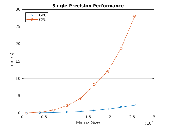 fig = figure; ax = axes('parent', fig); plot(ax, results.sizeSingle, results.timeSingleGPU, '-x', ... results.sizeSingle, results.timeSingleCPU, '-o') grid on; legend('GPU', 'CPU', 'Location', 'NorthWest'); title(ax, 'Single-Precision Performance') ylabel(ax, 'Time (s)'); xlabel(ax, 'Matrix Size'); drawnow;