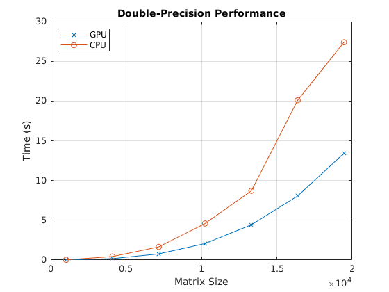 fig = figure; ax = axes('parent', fig); plot(ax, results.sizeDouble, results.timeDoubleGPU, '-x', ... results.sizeDouble, results.timeDoubleCPU, '-o') legend('GPU', 'CPU', 'Location', 'NorthWest'); grid on; title(ax, 'Double-Precision Performance') ylabel(ax, 'Time (s)'); xlabel(ax, 'Matrix Size'); drawnow;