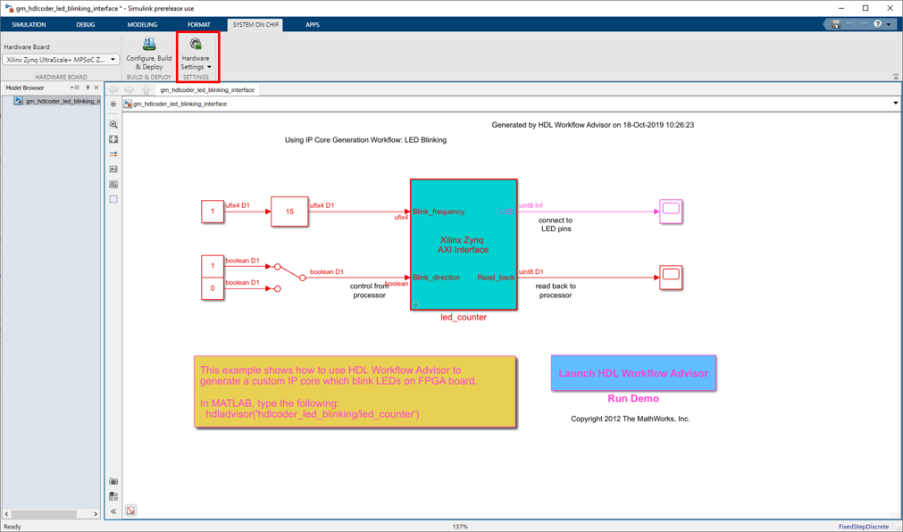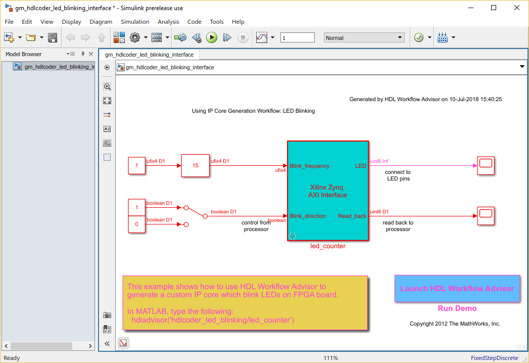 Этим примером является пошаговое руководство, которое помогает вам использовать программное обеспечение HDL Coder™, чтобы сгенерировать пользовательское ядро IP HDL, которое мигает светодиодами на Xilinx Zynq UltraScale + оценочный комплект MPSoC ZCU102 и показывает, как использовать Embedded Coder®, чтобы сгенерировать код С, который работает на процессоре ARM®, чтобы управлять частотой мигания LED.