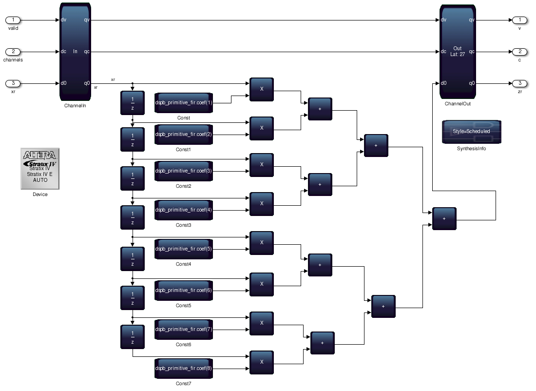 В этом примере проект или подсистема генерации кода, содержит две части: один с собственными блоками Simulink®, и один с блоками Altera® DSP Builder Advanced. Блоки Altera® сгруппированы в Подсистеме DSPBA (hdlcoder_sldspba/SLandDSPBA/DSPBA Подсистема). Altera® DSP Builder оптимизирует эти блоки для Altera® FPGAs. В остальной части проекта блоки Simulink® и HDL Coder™ предлагают много функций модельно-ориентированного проектирования, такой, как распределено конвейеризация и балансировка задержки, чтобы выполнить оптимизацию уровня модели.