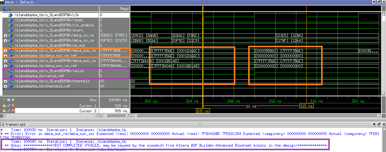 После симуляции сгенерированного кода и испытательного стенда, вы видите, что выходные параметры от кодера HDL совпадают со справочными данными только, когда допустимый сигнал утверждается.