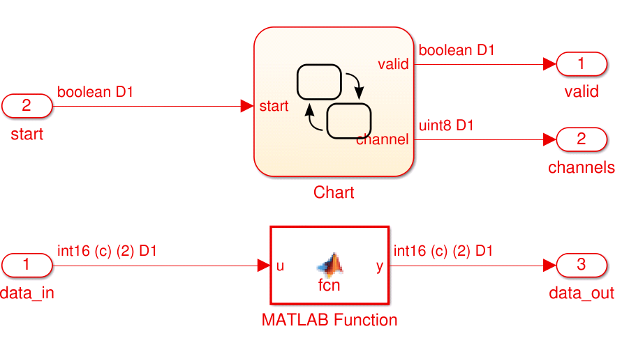 В этом примере диаграмма Stateflow генерирует канал и допустимые сигналы управлять подсистемой DSPBA.