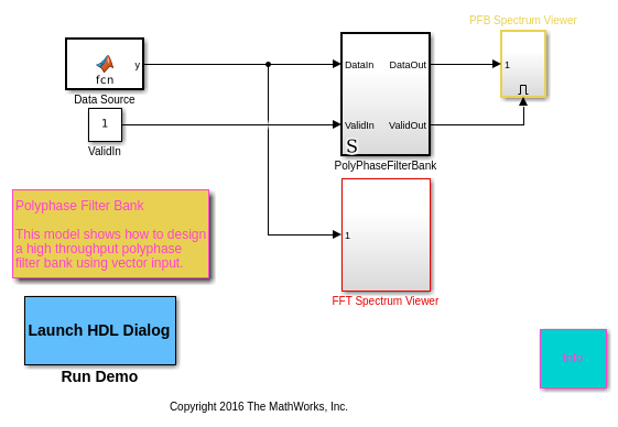 Модель является Многофазным Набором фильтров, который состоит из фильтра и БПФ что процессы 16 выборок за один раз. Смотрите Polyphase Filter Bank HDL Example для получения дополнительной информации о Многофазном Наборе фильтров.