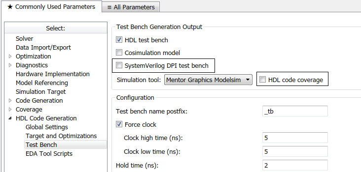 В качестве альтернативы можно установить опции SystemVerilog DPI испытательного стенда на 'генерации HDL-кода> Испытательный стенд' панель в Параметрах конфигурации.