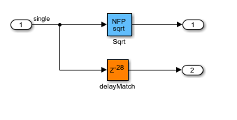 NFP Sqrt блок является оператором с плавающей точкой, соответствующим блоку Sqrt в вашей модели, и имеет задержку 28. Генератор кода определяет эту задержку и добавляет соответствующую задержку длины 28 в параллельном пути. Чтобы видеть задержку операции квадратного корня, дважды кликните NFP Sqrt блок. Длина Задержки Sqrt_pd1 блок соответствует задержке оператора.