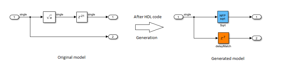 В сгенерированной модели вы видите что NFP Sqrt блок поглощает блок Delay, смежный с блоком Sqrt в вашей исходной модели. Это поглощение задержки происходит, потому что задержка оператора равна длине Задержки. Генератор кода поэтому избегает дополнительной задержки в вашей модели.