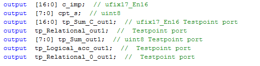 При генерации кода HDL Coder™ открывает отчет Генерации кода. Раздел Code Interface Report содержит ссылки на порты тестовой точки в Output Ports раздел.