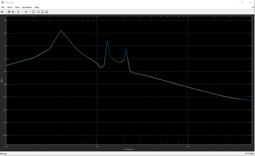 Звуковой сигнал подан в спектр анализатор после прохождения через КИХ-фильтр. Спектр анализатор вычисляет БПФ отфильтрованного сигнала, применяет функцию взвешивания и преобразует результат в dBm. Можно программировать тип взвешивания, которое будет выполняться при помощи интерфейса AXI4-Lite или как без взвешиваний, A-взвешивание, C-взвешивание или как K-взвешивание. Фактические функции взвешивания реализованы с помощью интерполяционных таблиц, которые были сгенерированы при помощи функции Audio Toolbox™ weightingFilter.