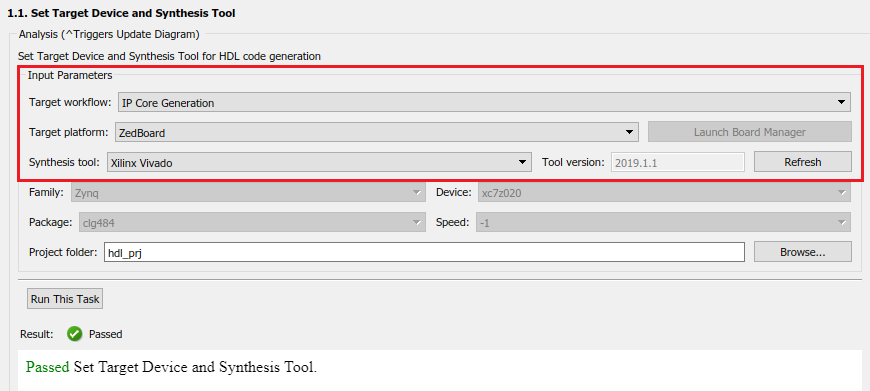 В этой задаче, IP Core Generation выбран для Целевого рабочего процесса и ZedBoard выбран для Целевой платформы.