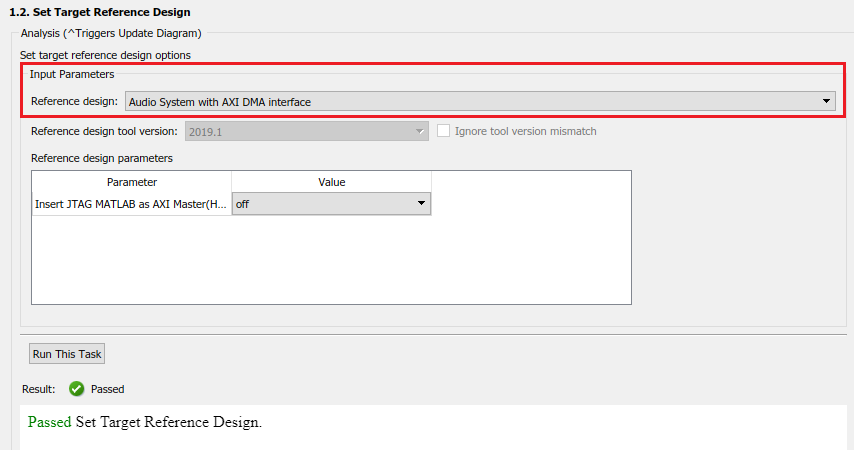 Целевые интерфейсные настройки уже сохранены для ZedBoard в этой модели в качестве примера, таким образом, настройки в задачах 1.1 к 1,3 автоматически загружаются. Чтобы узнать больше о сохранении цели соединяют интерфейсом с настройками в модели, можно обратиться к Сохранять Настройкам Целевого компьютера в примере Модели.