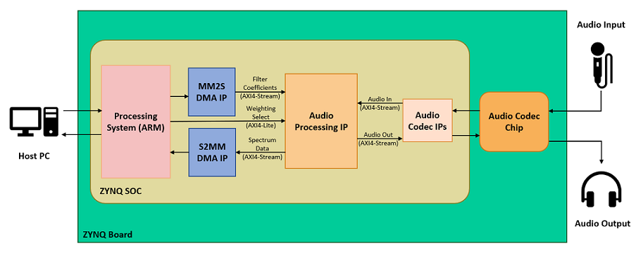 Дюйм/с Аудиокодека конфигурирует аудиокодек и передает аудиоданные между ZedBoard и аудиокодеком. IP Обработки аудиоданных, сгенерированный HDL Coder™, выполняет анализ спектра и фильтрация. Дюйм/с DMA передает AXI4-потоковые данные между Системой обработки и FPGA. Потоковые данные передали от Системы обработки до программ MM2S DMA IP коэффициенты фильтра на FPGA. Потоковые данные, полученные Системой обработки через S2MM DMA IP, содержат данные о спектрограмме, вычисленные на FPGA. Система обработки также конфигурирует кривую взвешивания для анализа спектра с помощью интерфейса AXI4-Lite.