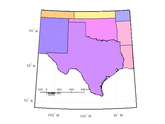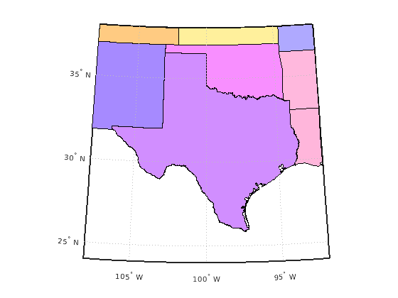 states = shaperead('usastatehi.shp', 'UseGeoCoords', true); figure usamap('Texas') faceColors = makesymbolspec('Polygon',... {'INDEX', [1 numel(states)], ... 'FaceColor', polcmap(numel(states))}); geoshow(states,'DisplayType', 'polygon', ... 'SymbolSpec', faceColors)