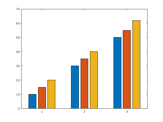 y = [10 15 20; 30 35 40; 50 55 62]; b = bar(y);