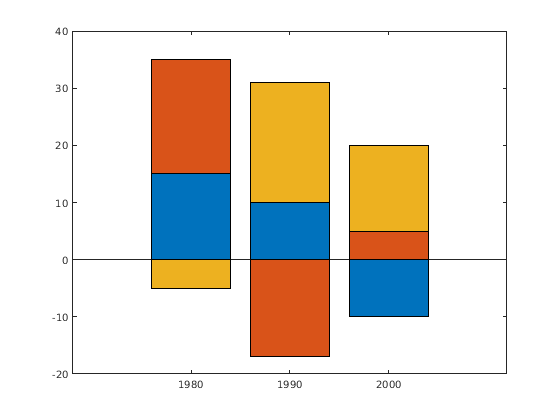 Задайте x как вектор трехлетних значений. Задайте y как матрица, которая содержит комбинацию отрицательных и положительных значений. Отобразите значения в столбчатом графике.