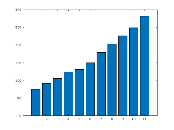 y = [75 91 105 123.5 131 150 179 203 226 249 281.5]; bar(y,0.4)