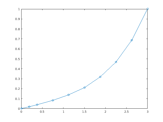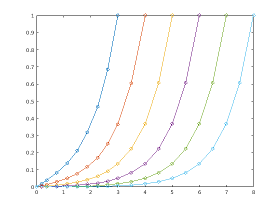 hold on for k = 4:8 solinit = bvpinit(sol,[0 k]); sol = bvp4c(@bvpfun, @bcfun, solinit); plot(sol.x(1,:),sol.y(1,:),'-o') end