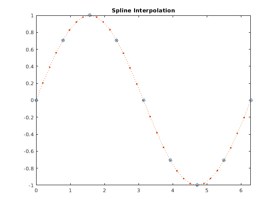 figure vq2 = interp1(x,v,xq,'spline'); plot(x,v,'o',xq,vq2,':.'); xlim([0 2*pi]); title('Spline Interpolation');