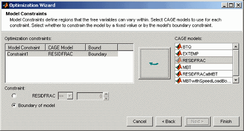 Добавьте ограничения. Можно добавить граничное ограничение модели в мастере. Используйте представление Optimization, чтобы применить другие типы ограничений (ограничения модели, линейные, эллипсоид, 1D таблица, 2D таблица и область значений). Смотрите Ограничение Редактирования для деталей всех этих ограничений.