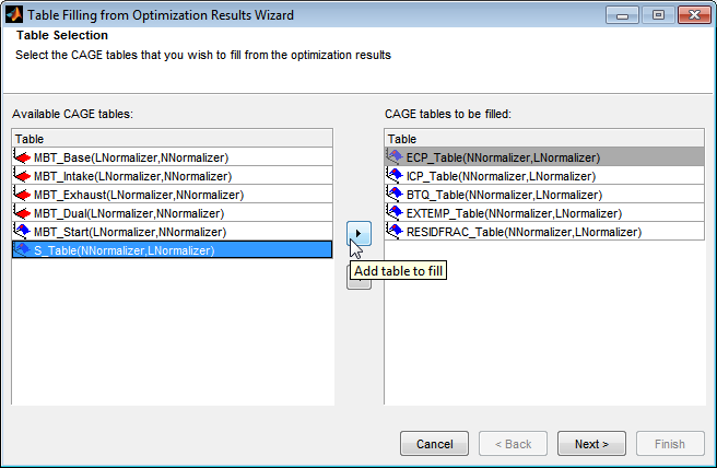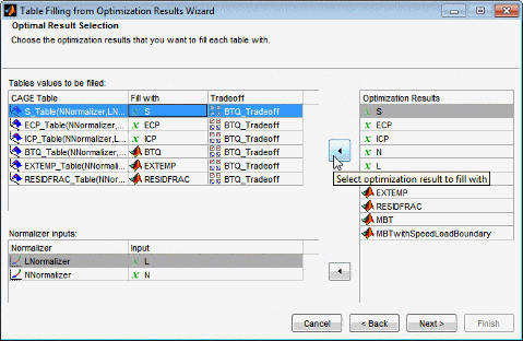 Когда вы будете готовы заполнить интерполяционные таблицы результатами оптимизации, открыть Интерполяционную таблицу, Заполняющую от Мастера Результатов оптимизации, выберите свои таблицы с входом нормализатора модели ответа, например, MAINFUEL_norm, и нажмите Next.